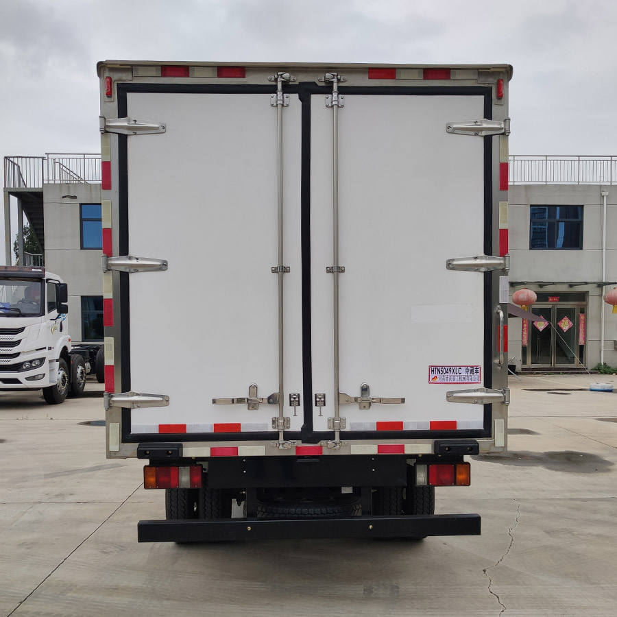 廂板:各隔熱廂板的內(nèi)外蒙皮可采用整張玻璃鋼復(fù)合材料,也可采用不銹鋼板等金屬蒙皮,金屬蒙皮采用縫焊機(jī)設(shè)備對(duì)焊整張;隔熱層采用硬質(zhì)聚氨酯泡沫,隔熱層及加強(qiáng)埋件使用高強(qiáng)度樹(shù)脂膠粘接,經(jīng)過(guò)900T熱壓機(jī)加溫加熱,全封閉固化為一體,廂板內(nèi)外表面平整光滑。